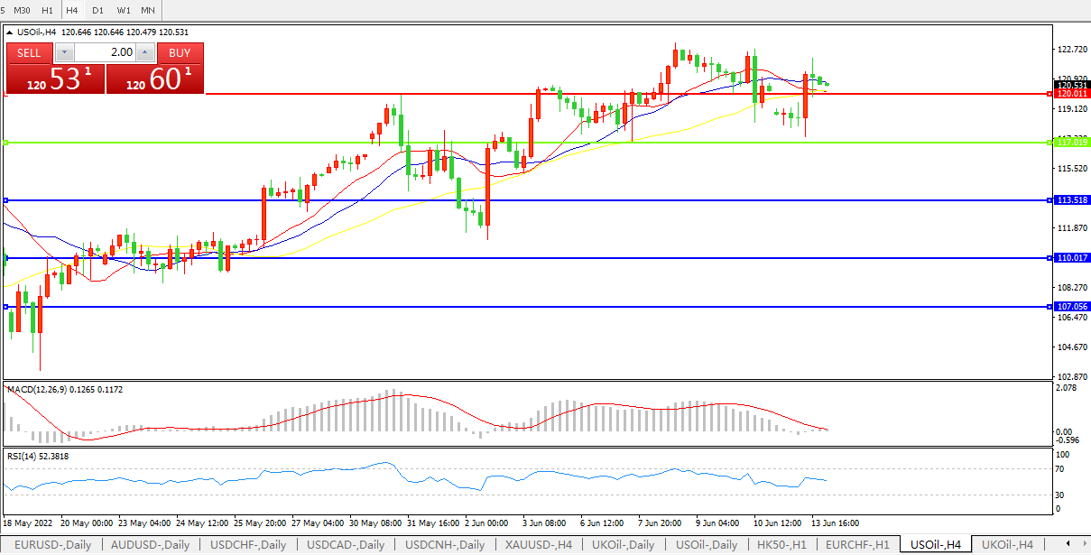4小时图看,油价运行于均线附近,短线继续盘整概率较大, MACD动能柱逐步缩短,RSI指标中性,日内继续整理概率较大。