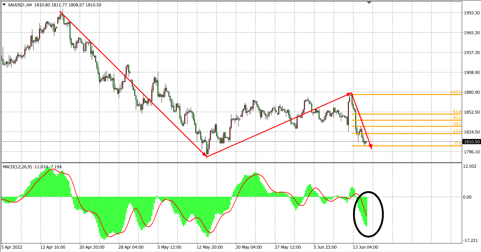 4小时图看,金价仍处于较明显的下跌趋势,昨日走出“倒V形反转”直接跌破低点1824,同时MACD也是在零轴之下放量,显示空头力量强劲。结合走势形态和技术指标分析,黄金大概率延续自今年3月以来的下跌趋势,后市逢高做空是更合适的操作节奏。