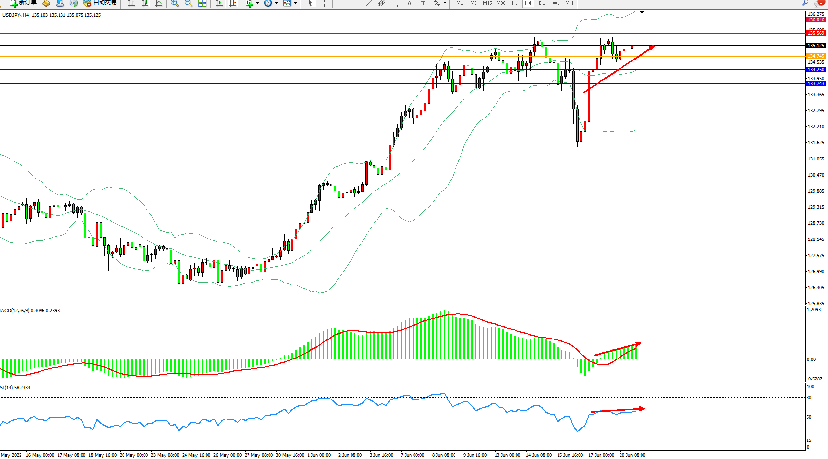 4小时图看:低位V型反转拉升上移后,处于布林带指标通道中上轨区间窄幅整理,短期多头动力有继续向上移动态势,布林带指标呈张口走势后开始收口,MACD指标处于0轴线上方多头区域维持整理平移,RSI指标处于50均衡线上側弱势徘徊中;