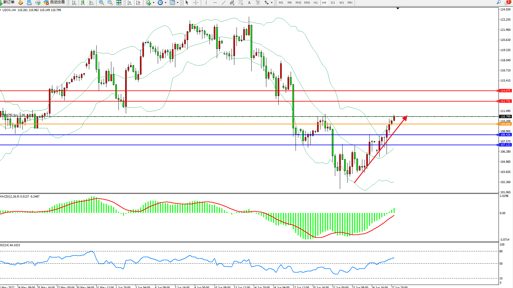 4小时图看:多头动力延续布林带指标上轨附近强势上攻,布林带指标呈张口走势持续中 ,MACD指标处于处于0轴线上方多头区域持续上移,RSI指标处于50均衡线上側缓慢拉升;