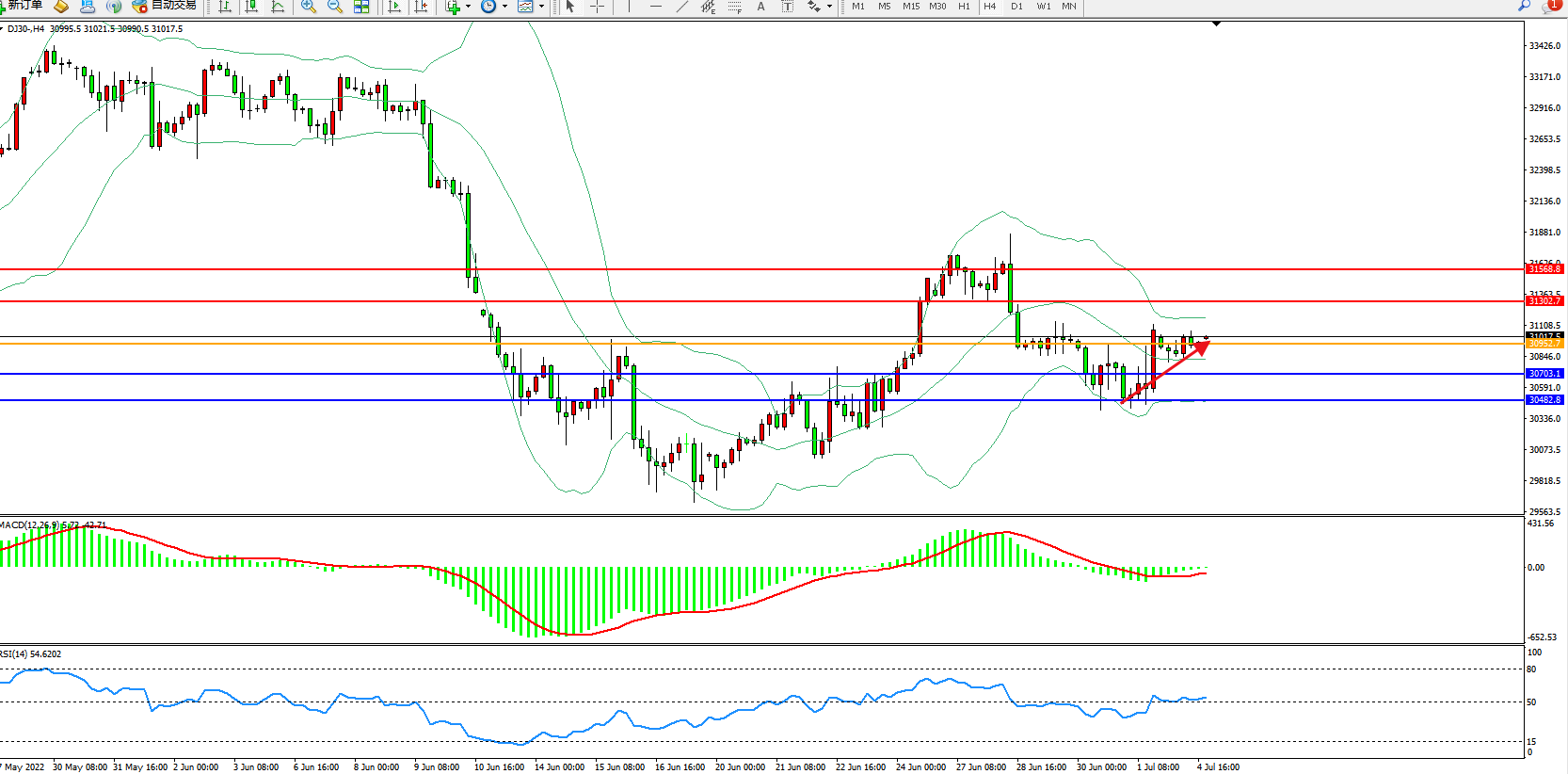 道琼斯指数7月1日(周五)收盘上涨322.03点,涨幅1.05%,报31097.46点;本周美国大量数据出炉、尤其消费者支出显示放缓后,摩根大通经济学家下调了对年中GDP增速的预测。本季度的预期增速也从2%降至1%。