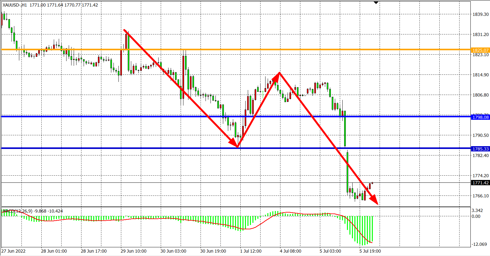 周二(7月5日)市场上演惊魂一夜,由于对欧洲经济的悲观预期弥漫,市场大幅削减对欧洲央行加息的押注,欧元跌至20年以来最低,其后带动非美货币进一步大跌,推动美指突破106续创新高,现货黄金也因此承压失守1770美元/盎司,当日暴跌40美元。在全球经济衰退重燃之际,凸显出美元的全球地位依然稳固,具备避险价值的黄金在大跌过后存在反弹修复机会。