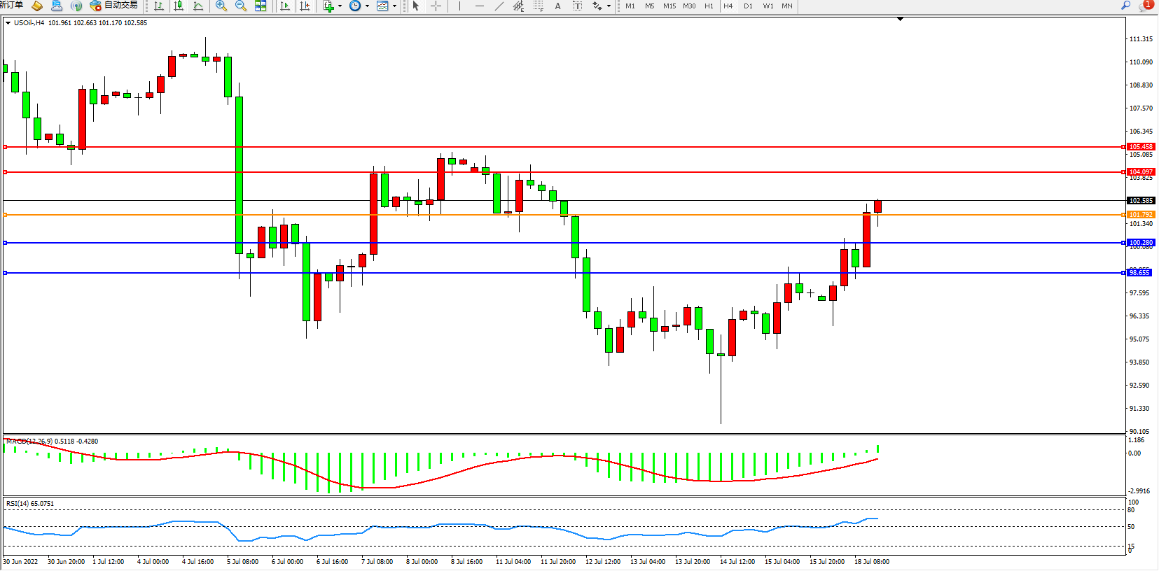 原油维持102.585附近震荡,拜登中东之行平淡收场,沙特方面并没有作出关于石油大幅增产的明确承诺。