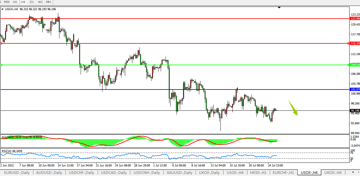 4小时图看:短线价格延续反弹, MACD量能柱0轴下缩量,RSI指标走势平缓,短期价格反弹后继续下行概率较大。