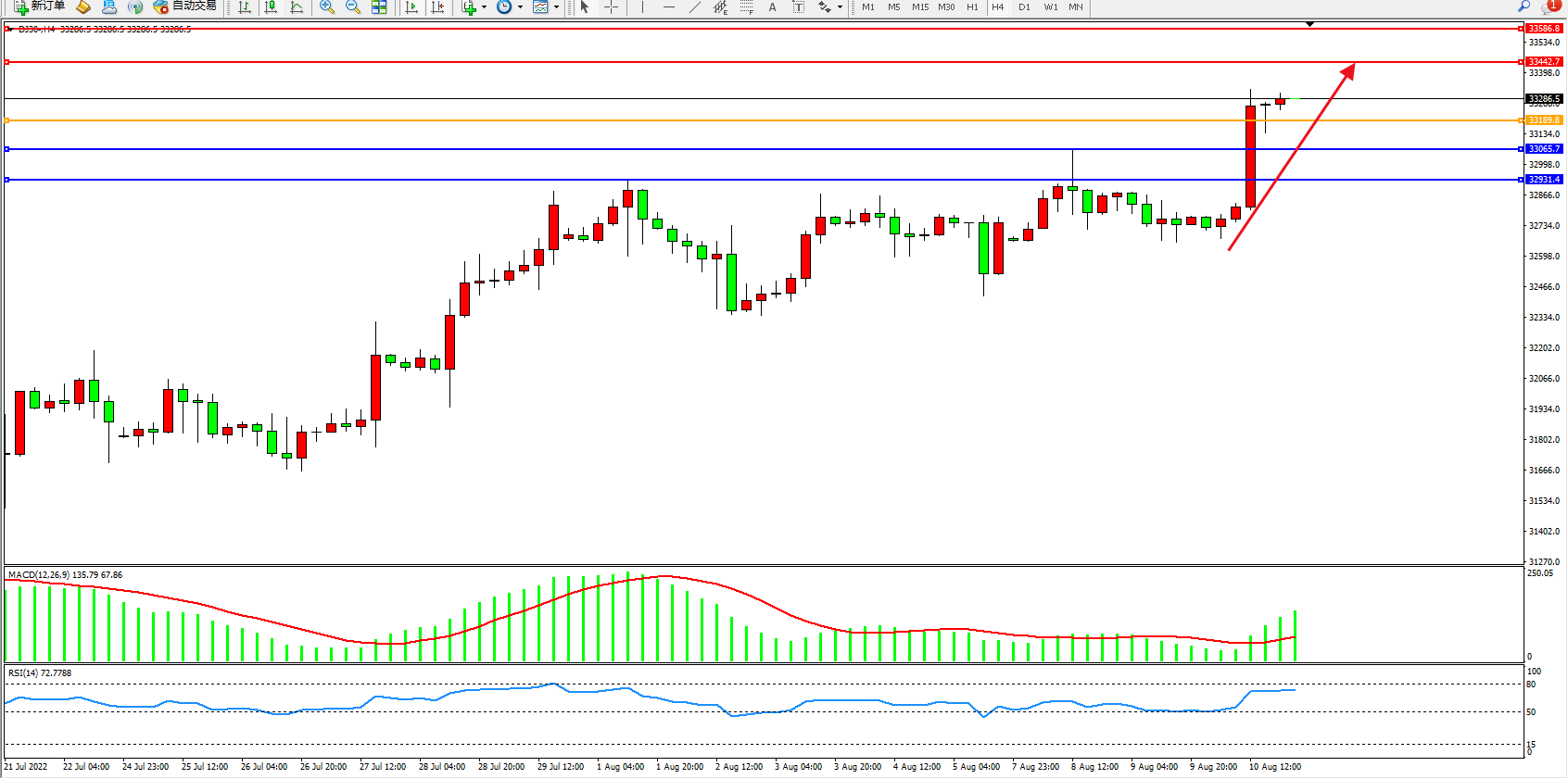 道琼斯指数8月10日(周三)收盘上涨535.04点,涨幅1.63%,报33309.45点;美国7月CPI数据低于预期,刺激美国国债大幅走阔,导致美联储期掉期合约大幅抛售。