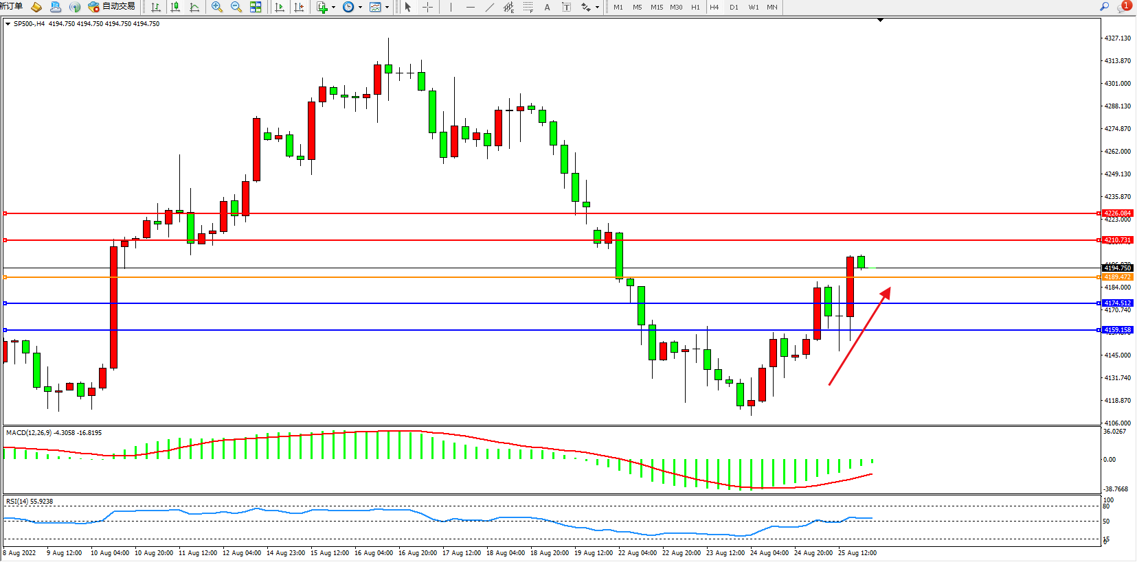 标普500指数8月25日(周四)收盘上涨60.33点,涨幅1.46%,报4201.10点;美联储主席鲍威尔将于周五发表演讲,投资者将对其进行剖析,寻找美联储在与处于几十年来高位的通胀作斗争时,可能在加息方面有多激进的迹象。