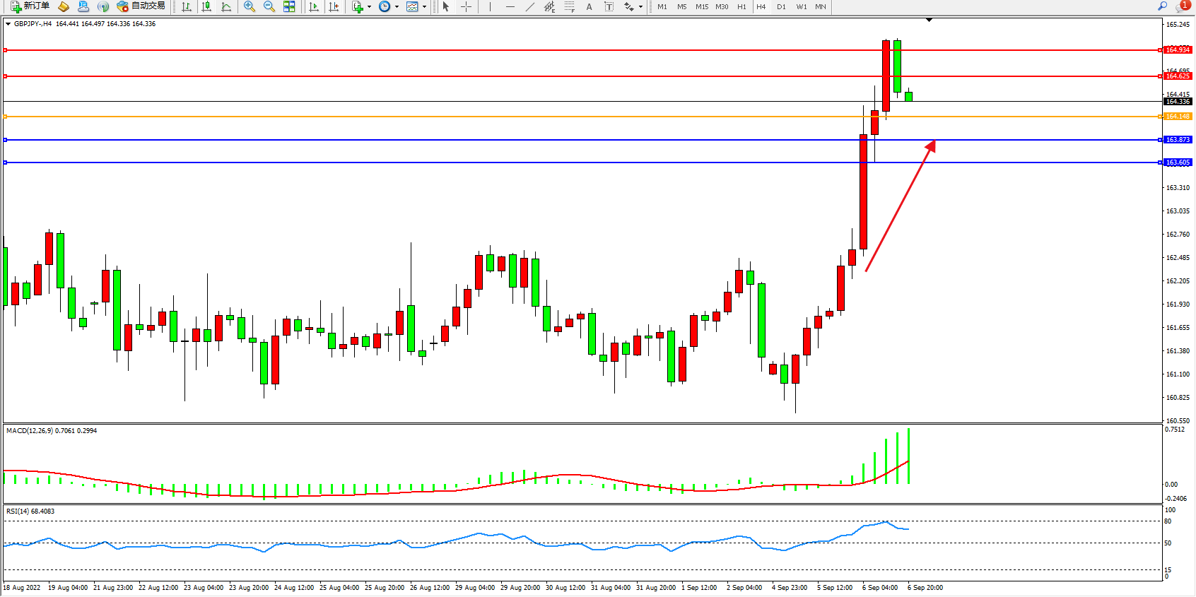 交易策略:164.148上方看涨,目标164.625、164.934
