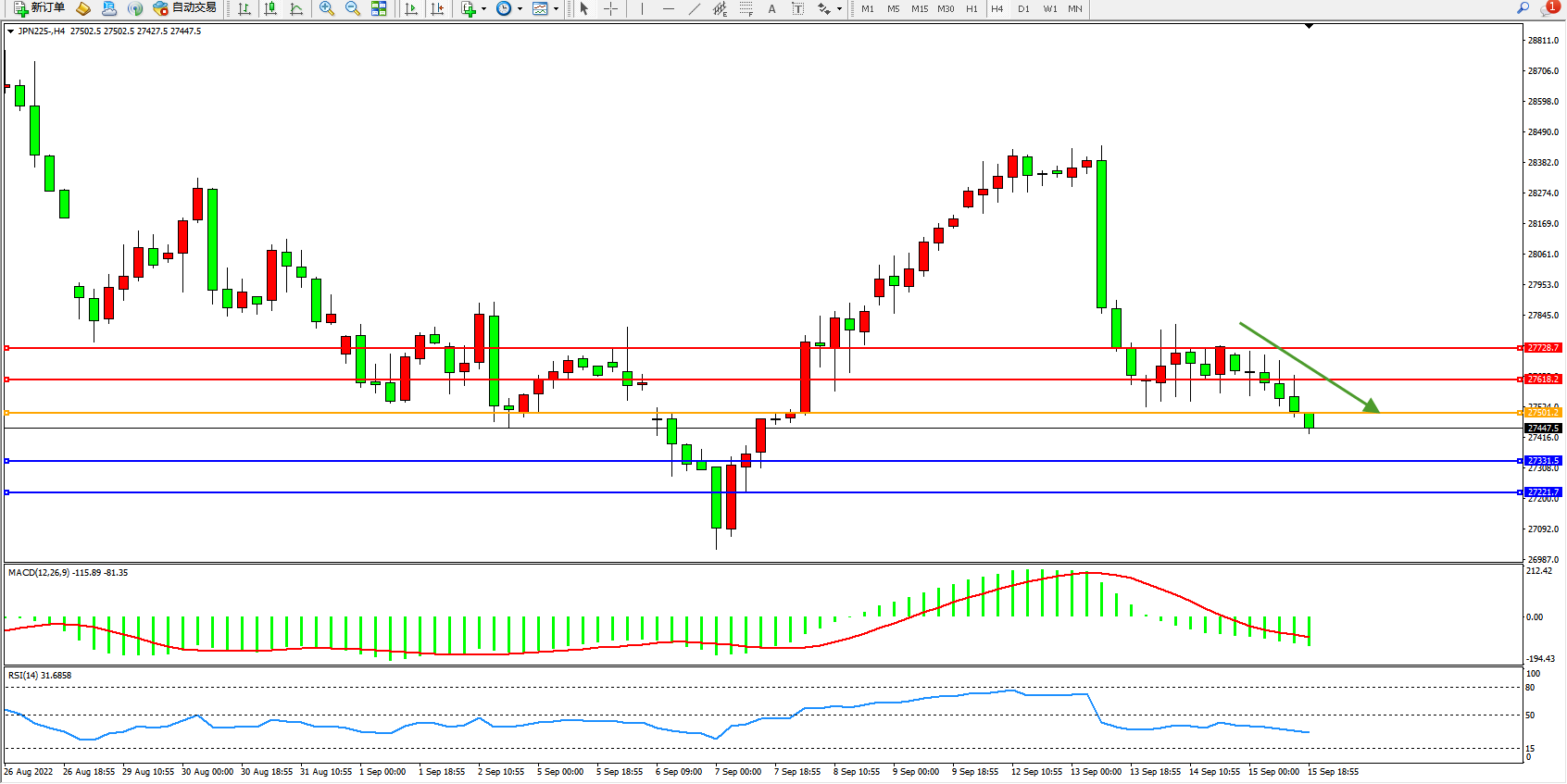 日经225指数9月15日(周四)收盘上涨57.38点,涨幅0.21%,报27876.00点。日本8月贸易逆差扩大至197.1亿美元的纪录高位。今年迄今日元累计下跌近20%。