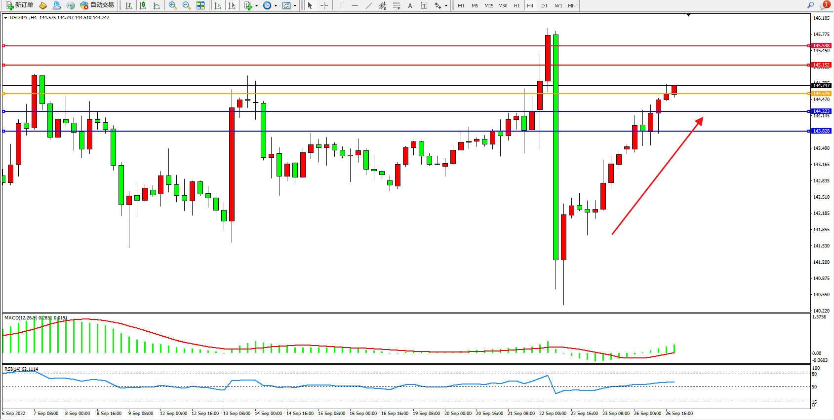 备选策略:144.579下方看跌,目标144.223、143.828