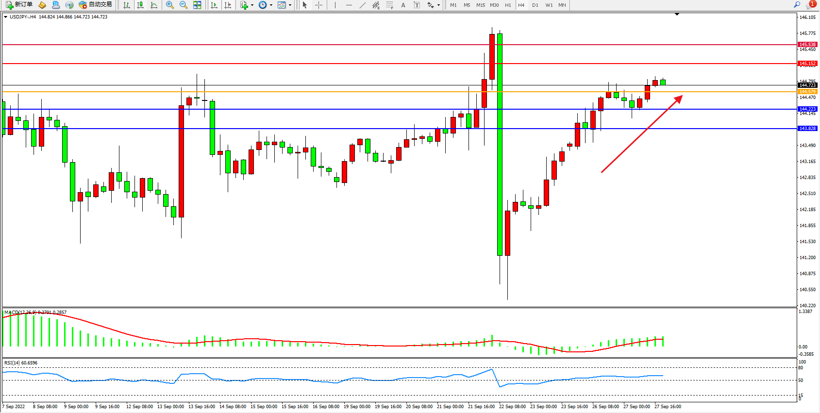 美元日圆USDJPY——4小时K线图显示: