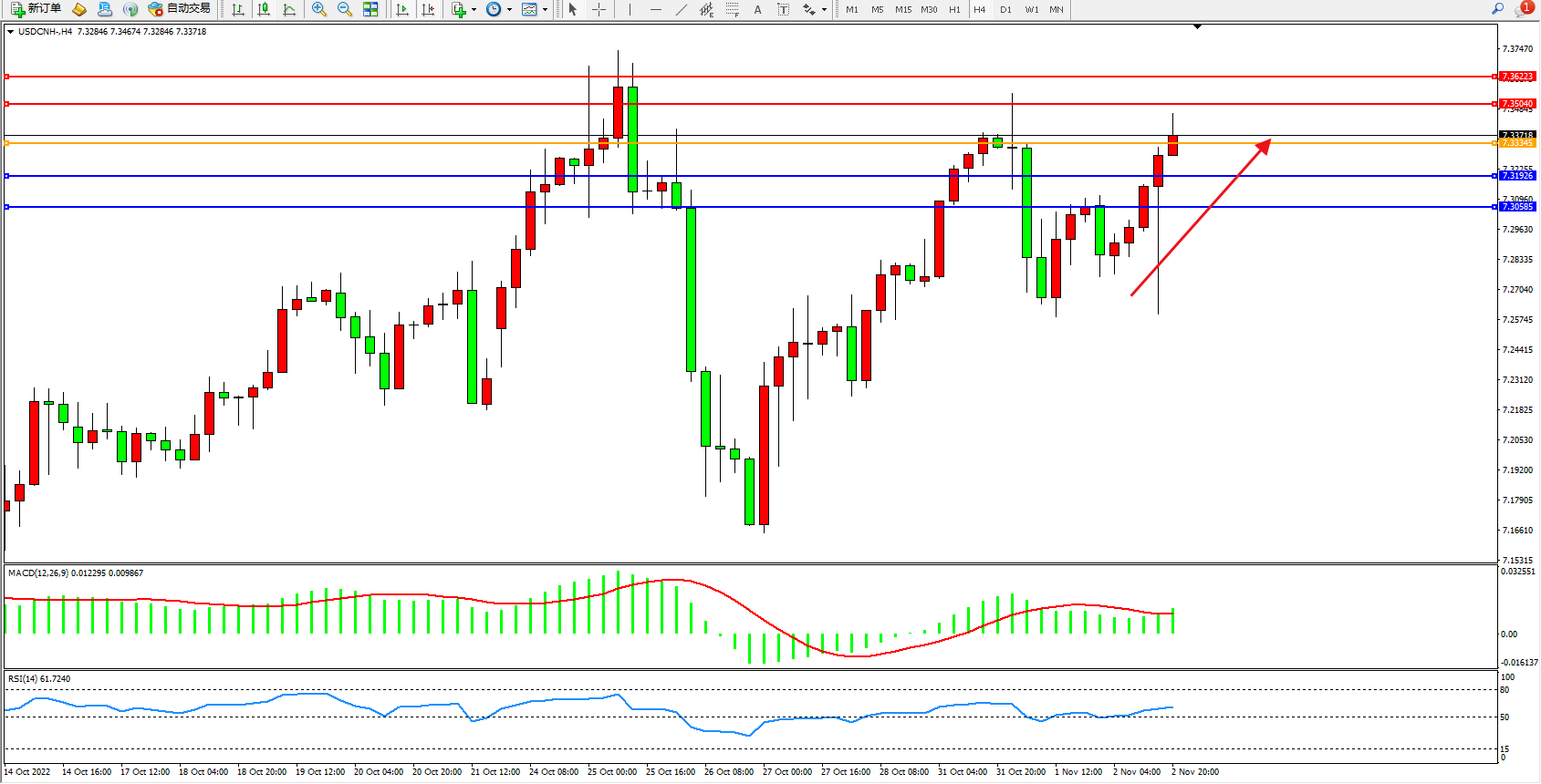 美元人民币USDCNH——4小时K线图显示:
