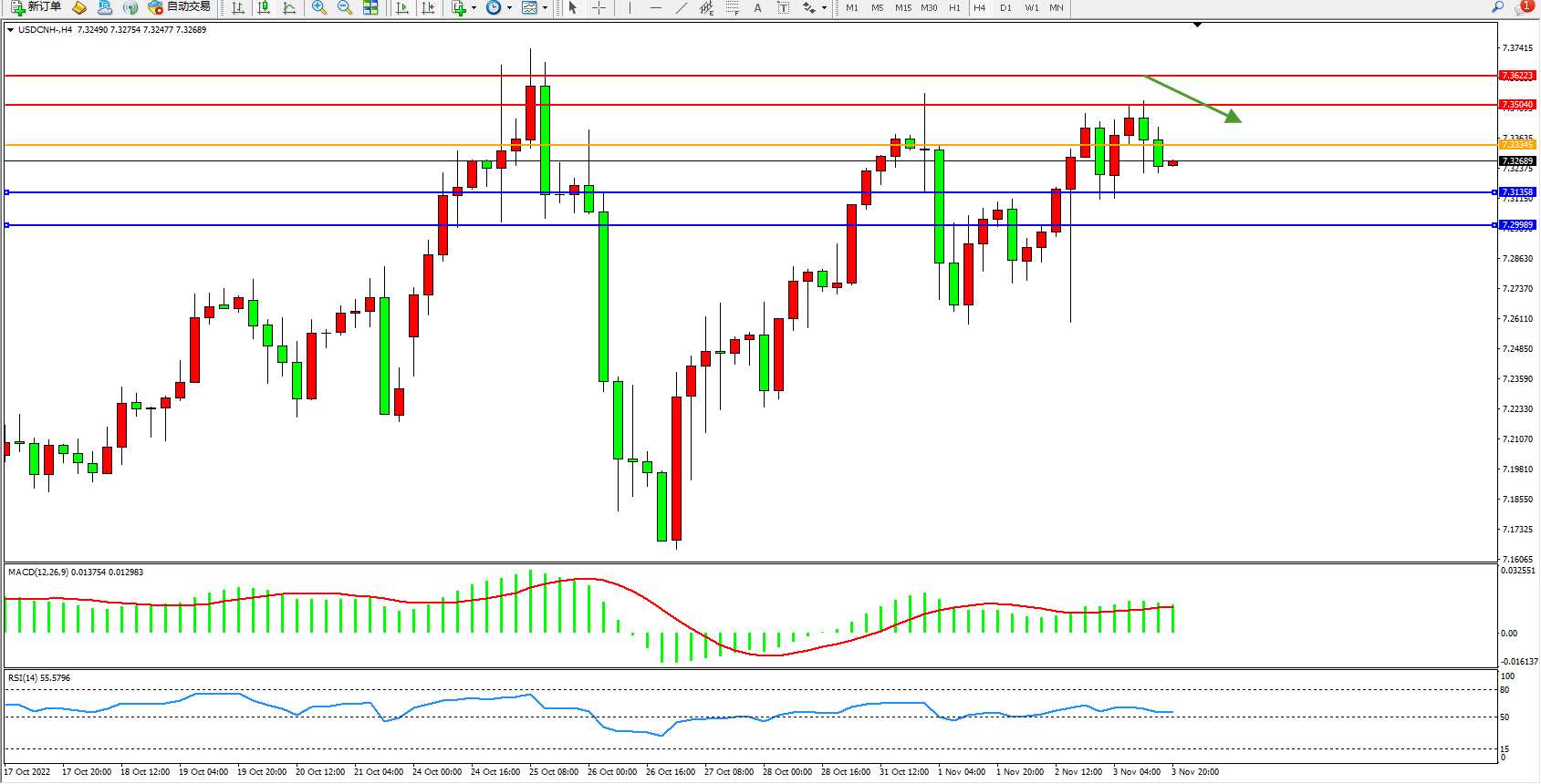 交易策略:7.33345下方看跌,目标7.31358、7.29989