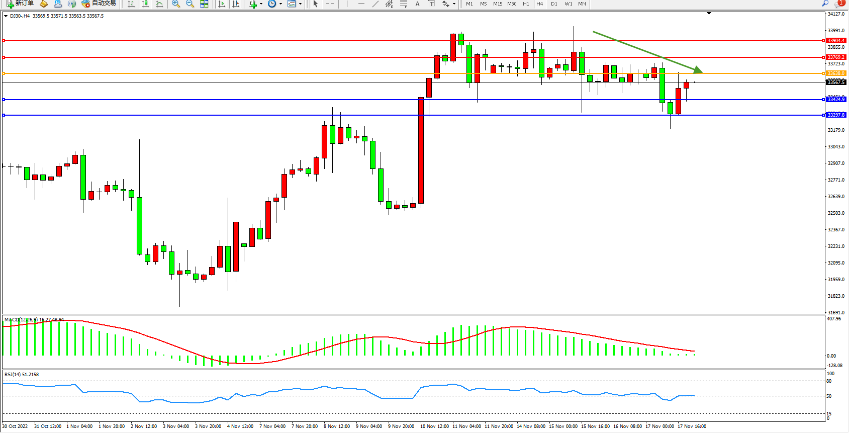 道琼斯指数11月17日(周四)收盘下跌7.38点,跌幅0.02%,报33546.45点;美国初请失业金申请人数意外小幅下降,保持在历史低点附近,显示出在其他经济领域降温之际,劳动力市场的强劲势头。尽管美联储积极减缓经济增长速度,以抑制居高不下的通胀,但雇主仍在稳步招聘。