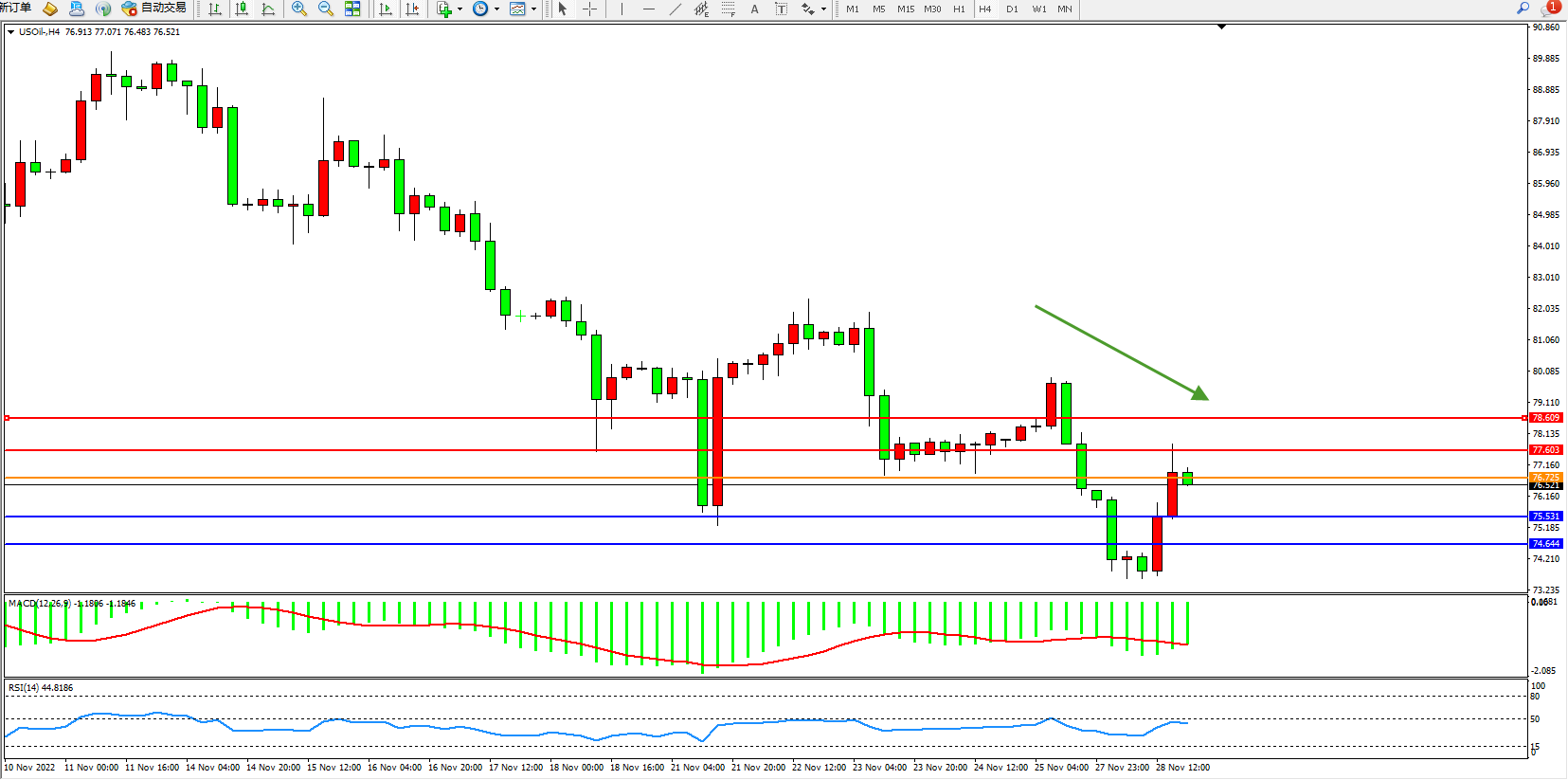 原油维持76.521附近震荡,国际油价跌创11个月新低,全球疫情不确定性上升加剧了需求担忧。除非OPEC+同意进一步减产,或者美国重新增加战略储备,否则油价可能会进一步下跌。