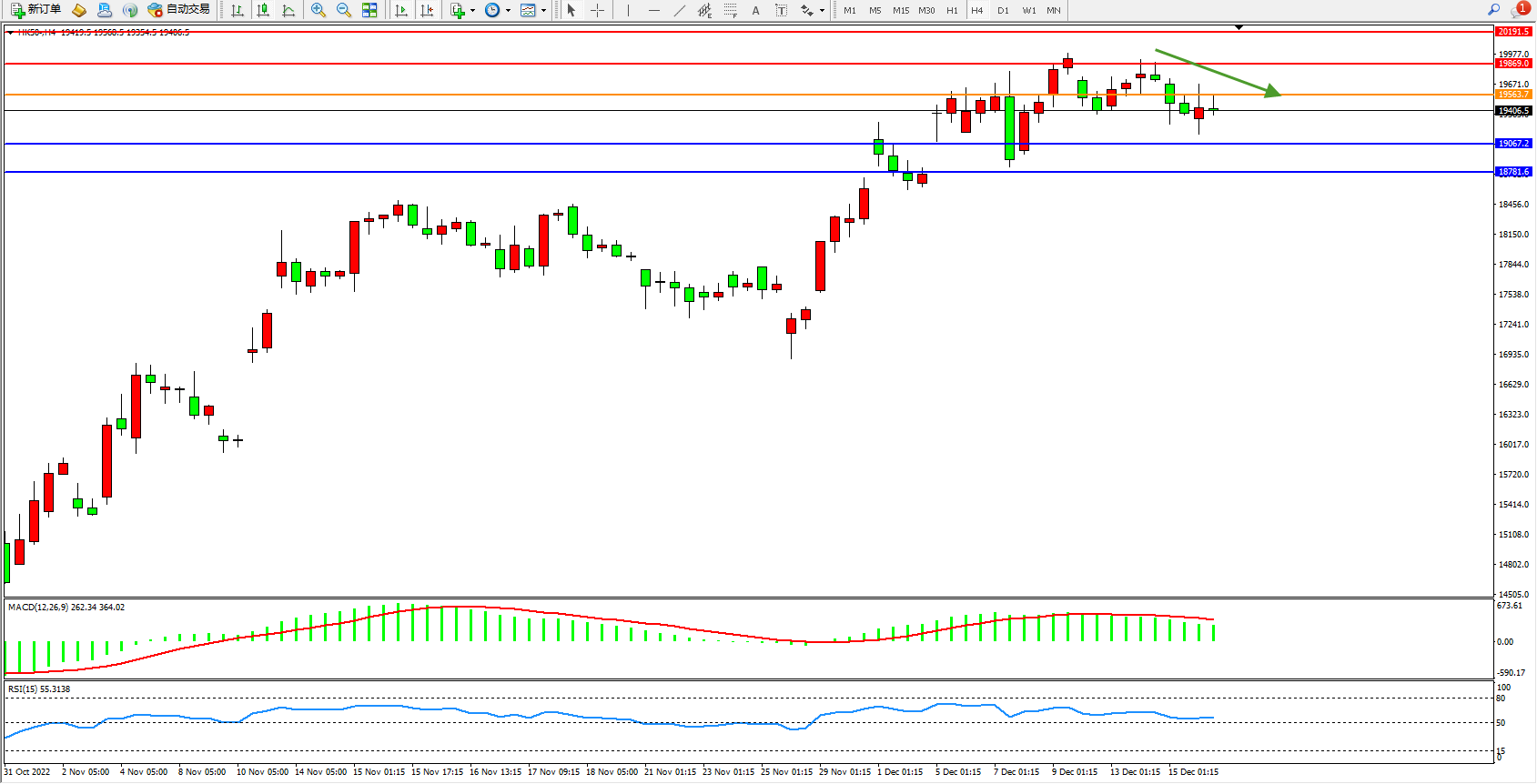 4小时图看:短期高位窄幅整理,市场整体处于短期弱势,看涨情绪减弱,市场空头情绪开始有伺机入场迹象,MACD指标处于多头区域整理平移,RSI指标处于50均衡线上側弱势徘徊;