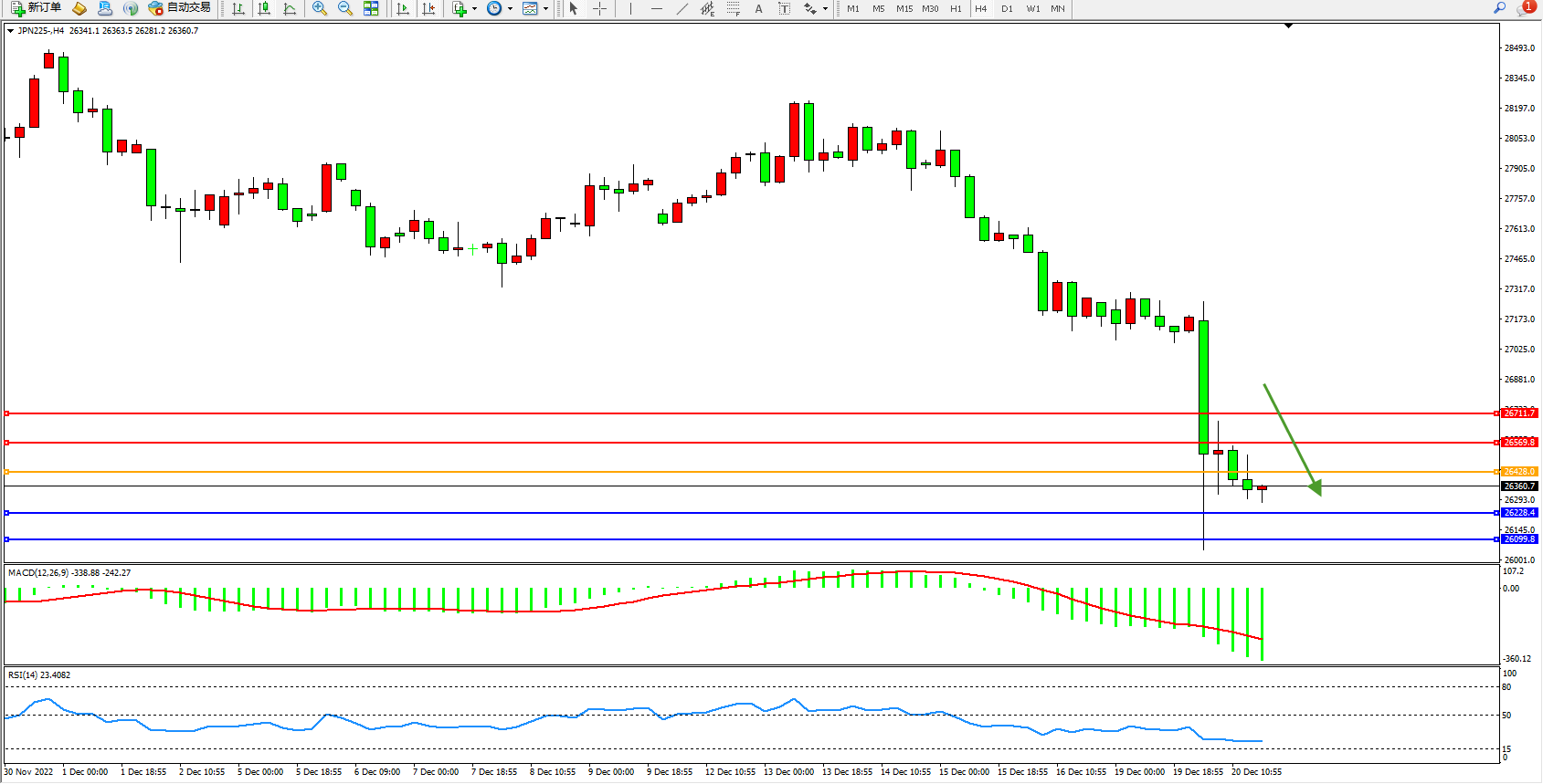 日经225指数12月20日(周二)收盘下跌672.64点,跌幅2.47%,报26565.00点。日本央行将基准利率维持在历史低点-0.1%,将10年期国债收益率目标维持在0%附近。将10年期国债收益率目标上限从0.25%上调至0.5%。保持对政策偏向的指引不变,将在必要时毫不犹豫地采取额外的宽松措施。