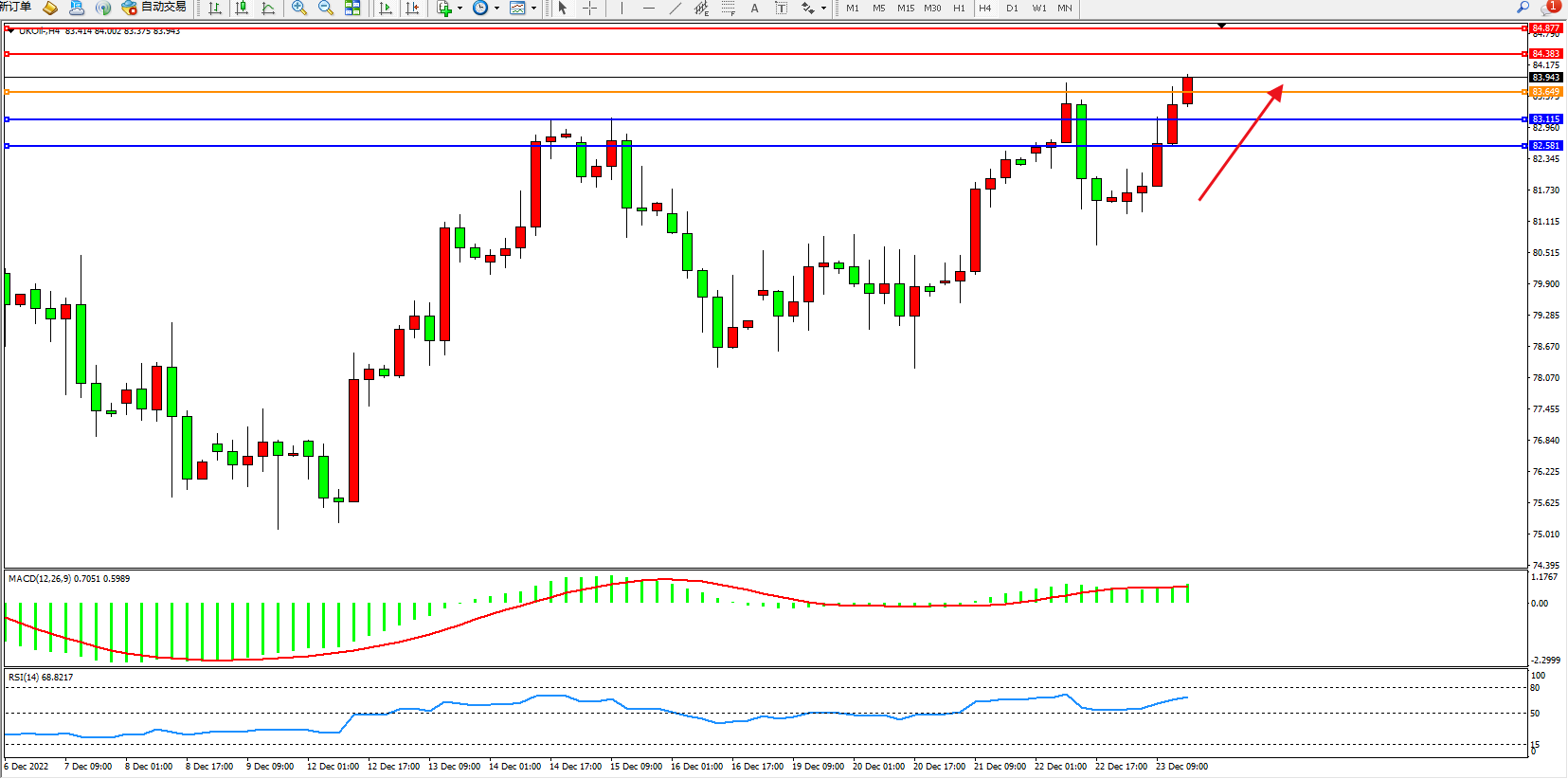 布油维持83.943附近震荡,俄罗斯可能会在2023年初削减5-7%的石油产量,减产量高达50-70万桶/日,以回应西方的石油价格上限措施。周一圣诞节休市一日。