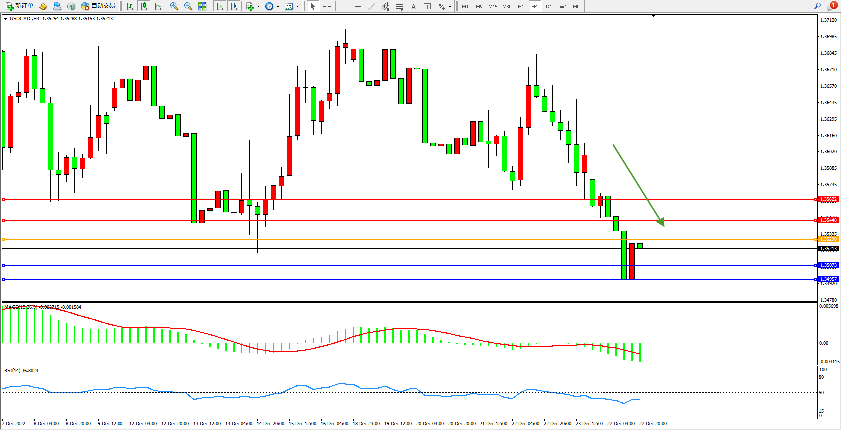 美元加元USDCAD——4小时K线图显示: