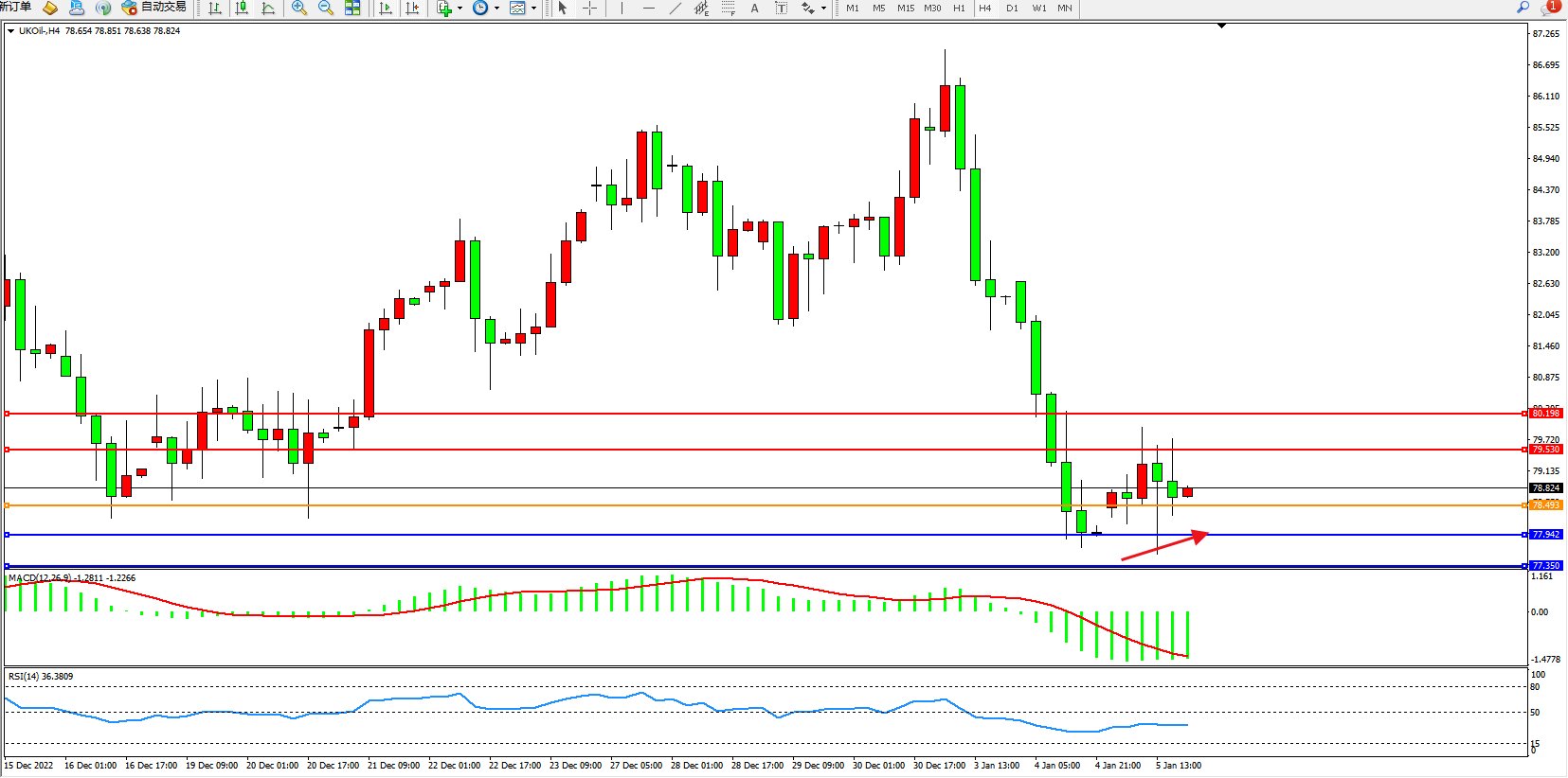 4小时图看:空头动力继续下行后,低位窄幅震荡,市场空头情绪笼罩,短期低位虽得到支撑上移,但整体处于偏弱势,MACD指标处于空头区域低位整理,RSI指标处于空头区域徘徊中;