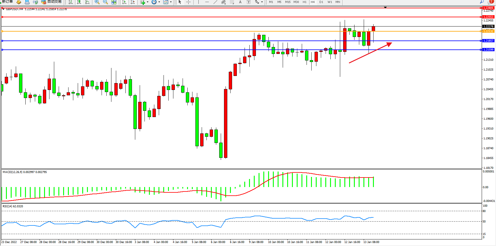 交易策略:1.22132上方看涨,目标1.22553、1.22805