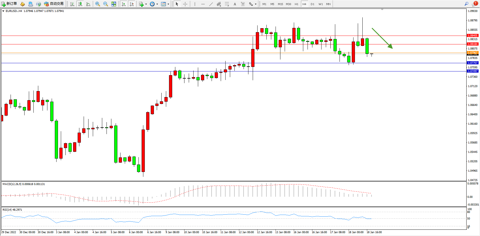 欧元美元EURUSD—4小时K线图显示:
