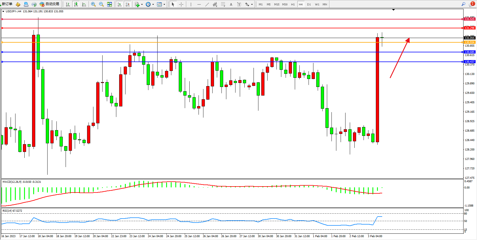 4小时图看:多头动力急速飙升,市场看涨情绪涌现,多头动力不断拉升上扬,MACD指标处于空头区域整理上移至0轴线附近徘徊,RSI指标处于50均衡线上側震荡;