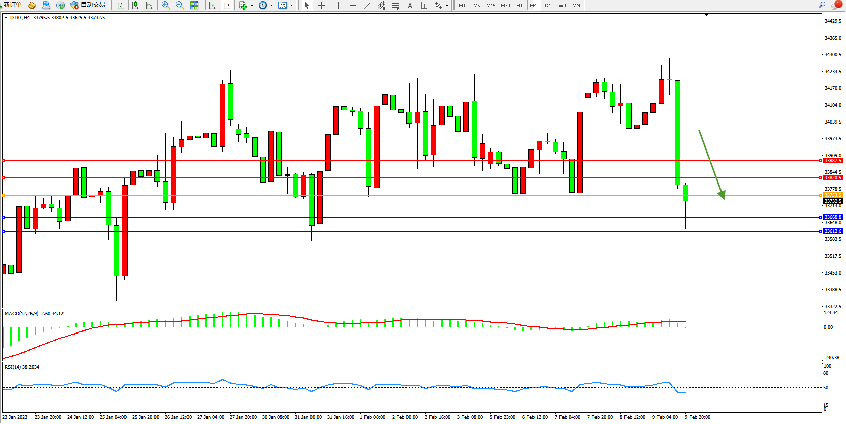 道琼斯指数2月9日(周四)收盘下跌248.47点,跌幅0.73%,报33700.54点;美国劳工部数据显示,美国至2月4日当周初请失业金人数 19.6万人,预期19万人,前值18.3万人。为2023年1月7日当周以来新高。