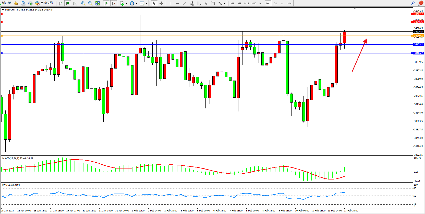 道琼斯指数2月13日(周一)收盘上涨377.05点,涨幅1.11%,报34246.32点;美国1月CPI数据将在北京时间周二(2月14日)21:30公布。市场预计,美国1月总体CPI与核心CPI分别上涨6.2%和5.5%,低于前值的6.5%和5.7%。但美国劳工部上周五(2月10日)对CPI数据的年度修正显示,12月份CPI月率被上修。