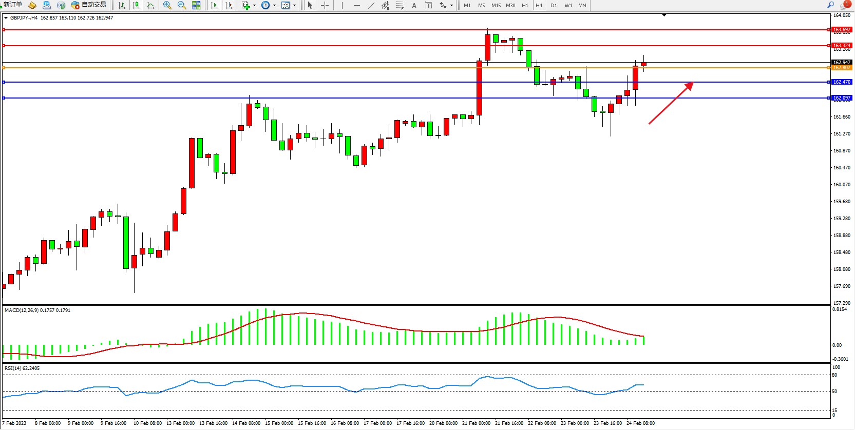 4小时图看:多头动力高位震荡上移,短期看涨情绪涌现,市场多头不断向上拉升,MACD指标处于0轴线上側徘徊,RSI指标处于50均衡线市场上移;