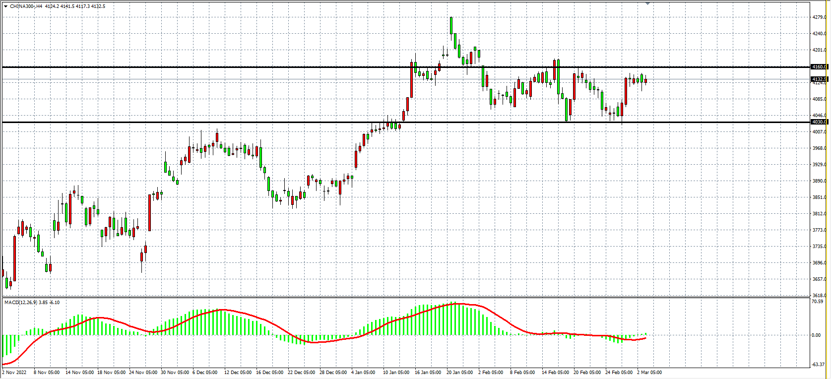 4小时图看,沪深300维持在4130附近盘整,同时MACD于零轴附近缩量,行情进入短暂整理,当前走势维持4030-4160箱体整理,若上破4160后市有望打开上行空间,上方看4250-4300附近。