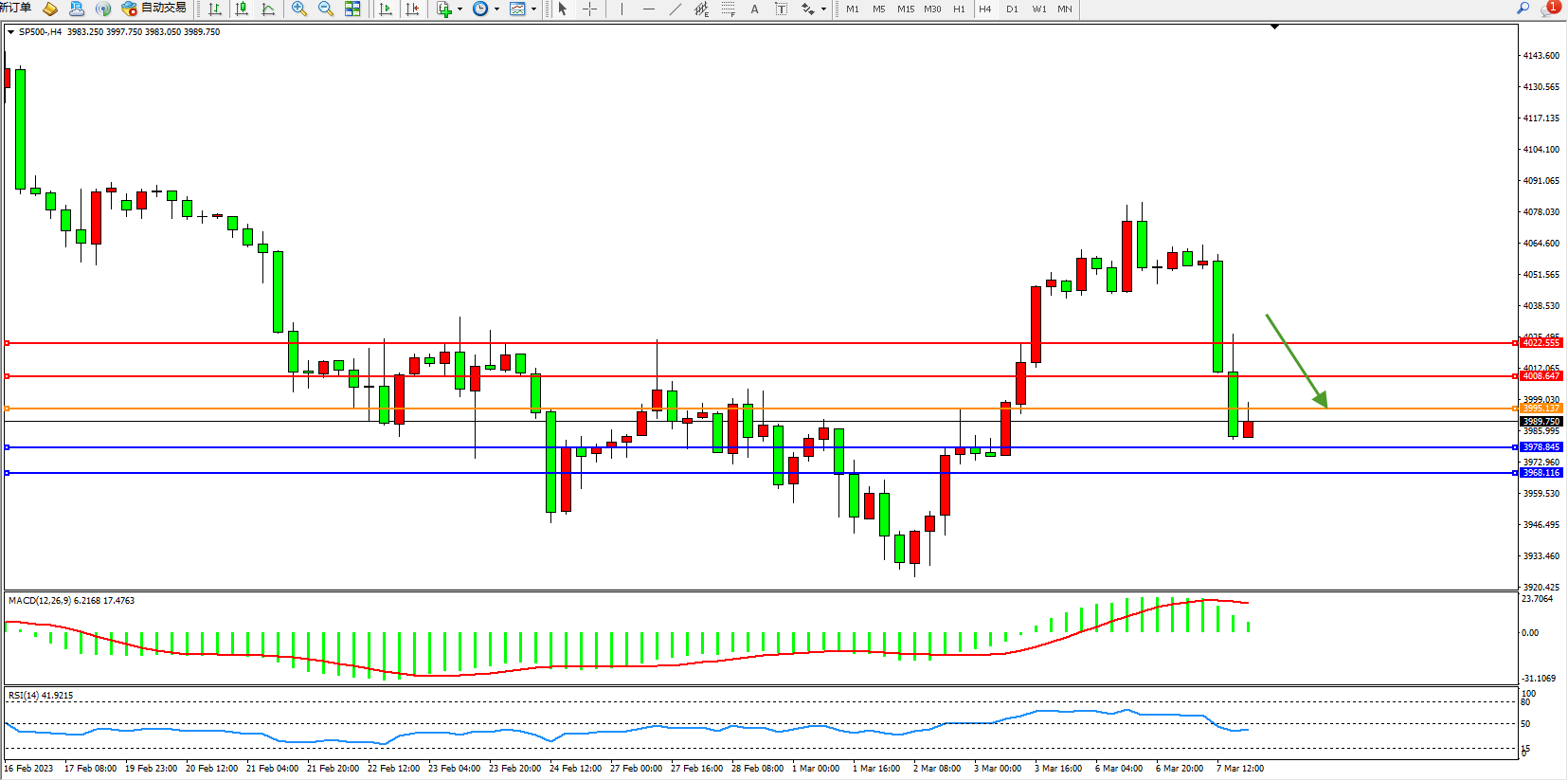 标普500指数3月7日(周二)收盘下跌60.82点,跌幅1.50%,报3987.60点;美联储主席鲍威尔的言论变得更加鹰派。鉴于鲍威尔的鹰派言论,市场对5.75%的终端利率定价并不令人意外。对SOFR期权市场的分析显示,在鲍威尔发表上述言论之前,市场已经倾向于终端利率会更高。