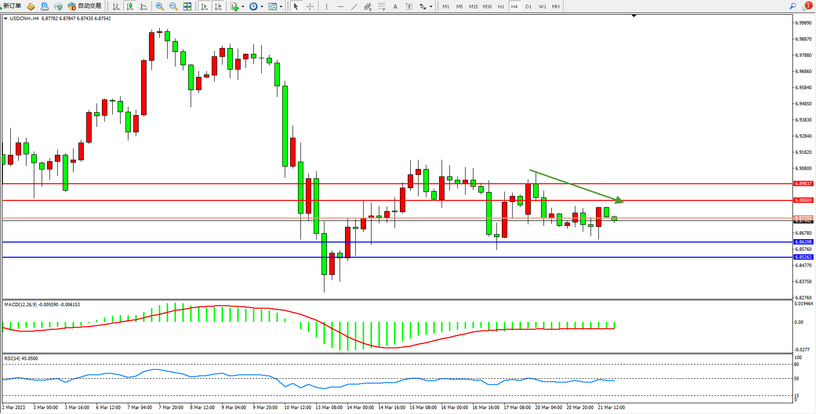 备选策略:6.87702上方看涨,目标6.88800  6.89837