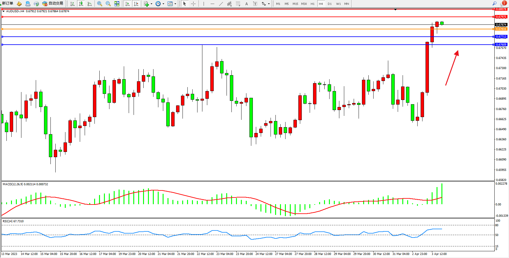 交易策略:0.67816上方看涨,目标0.67975  0.68078