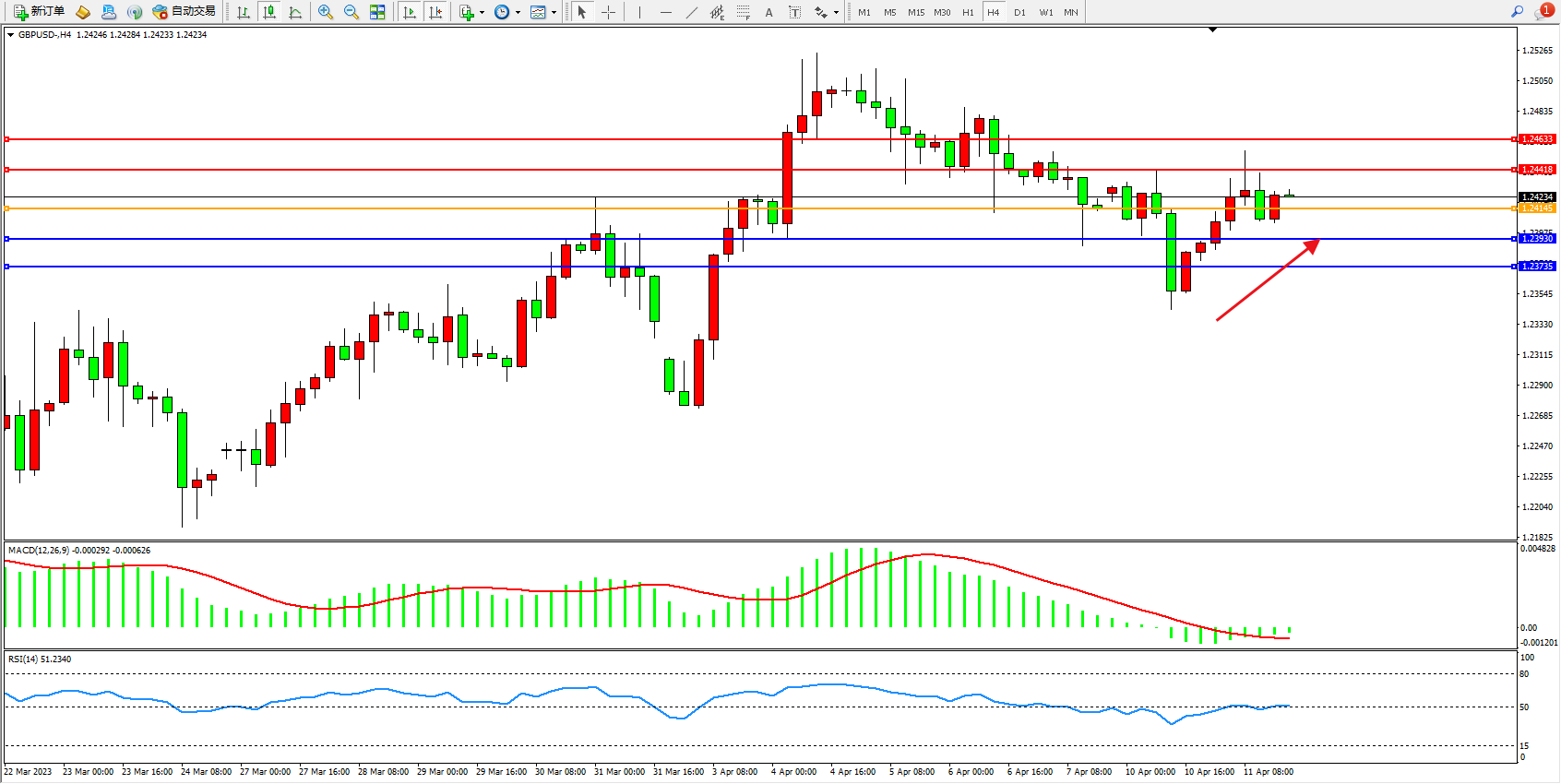 4小时图看:多头动力震荡上移后整理,市场上行动力减弱,但上行趋势依旧,MACD指标处于0轴线下侧徘徊,RSI指标处于50均衡线附近弱势徘徊;