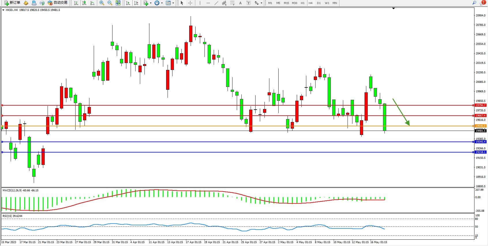 香港恒生指数5月17日(周三)收盘下跌417.68点,跌幅2.09%,报19560.57点;美元强势,人民币汇率破7,市场风险偏好谨慎。港股午后跌幅进一步加大,恒指跌2.09%下挫超400点,国指、恒生科技指数分别下跌2.25%和2.23%。普涨的大型科技股全部转跌,美团、小米跌超3%,香港立法会大会今日三读通过《2023年印花税(修订)条例草案》,落实《财政预算案》提出调整买卖物业的从价印花税税阶,南下资金全日净流入74.79亿港元,大市成交额缩量至1016亿港元。