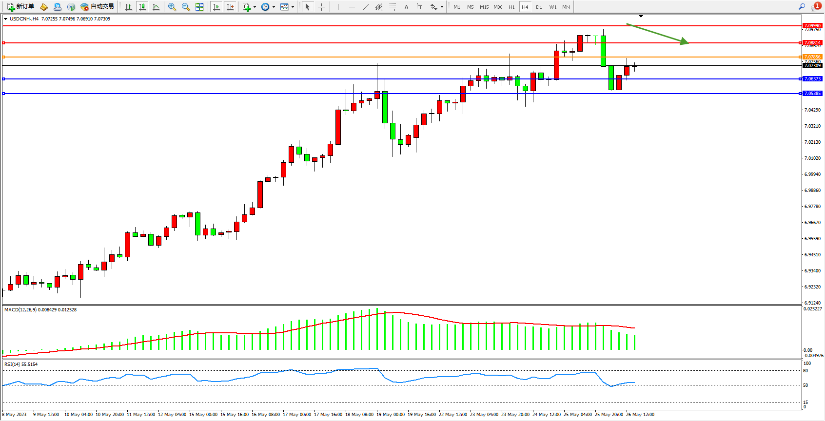 美元人民币USDCNH——4小时K线图显示: