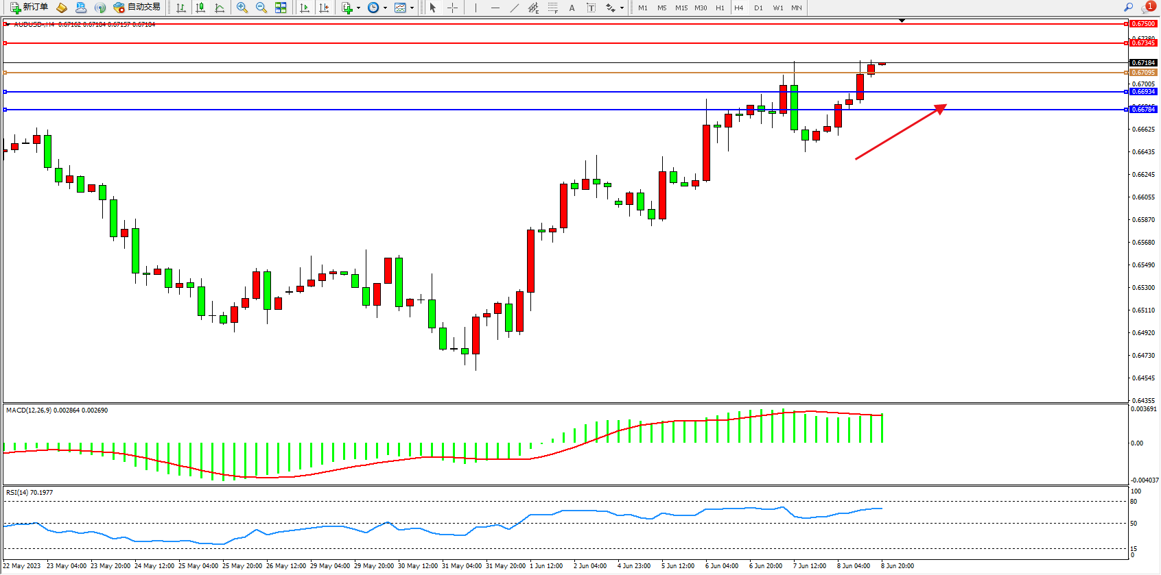 澳元兑美元维持0.67184附近震荡,澳大利亚将再加息25基点,将利率峰值提高至4.35%;澳大利亚4月商品及服务贸易帐111.6亿澳元,远低于预期的140亿澳元。