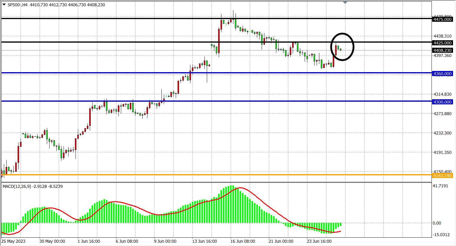 4小时图看,标普回调4370后开启反弹,MACD量能即将上传零轴,行情开启反弹势头,重点关注4425得失,该位之上看涨,之下看跌。