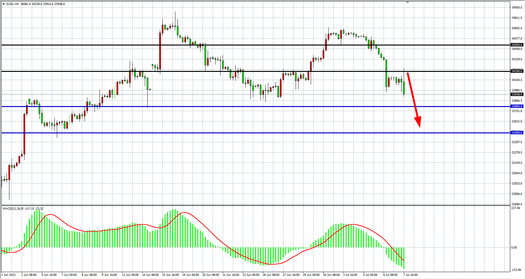 4小时图看,道指反弹34200一线受阻后跌至33900附近,MACD量能维持零轴下放量,下方支撑33800-33500,上方阻力34200-34500。