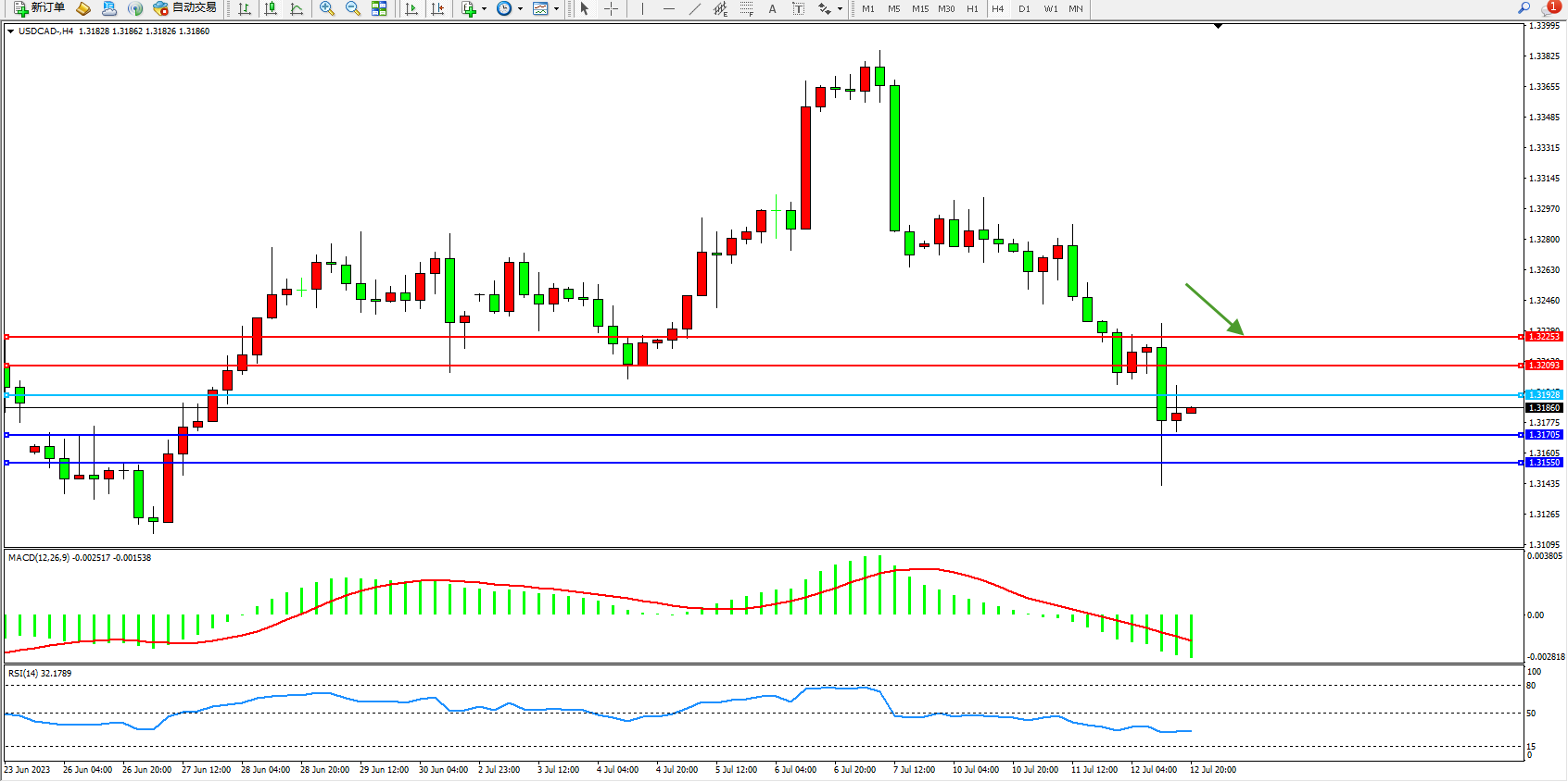 美元加元USDCAD——4小时K线图显示: