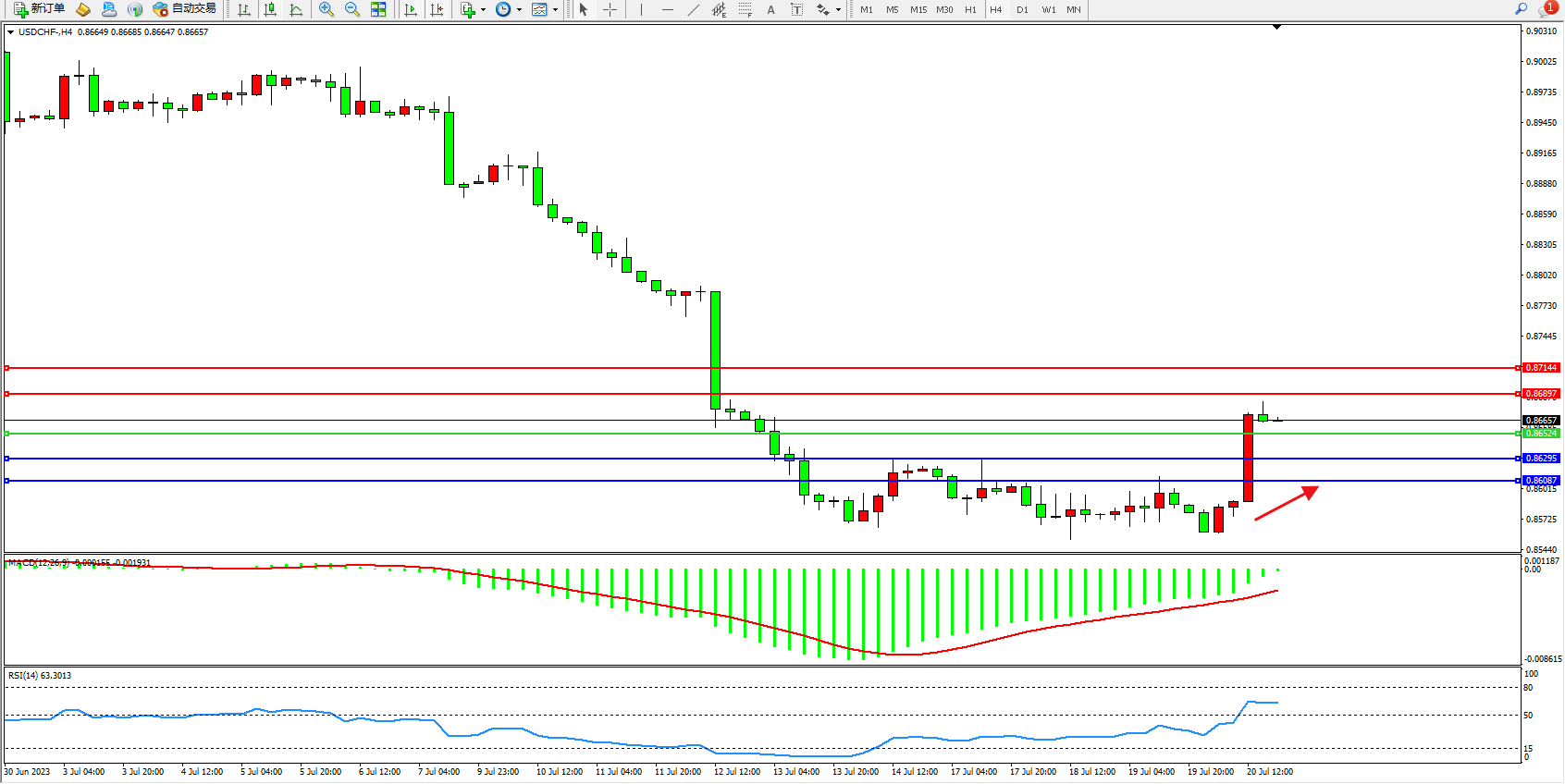 美元兑瑞郎维持0.86657附近震荡,瑞士6月份的贸易顺差略有收窄,当月出口增长4.3%,进口增长9.0%。值得注意的是,6月瑞士手表的名义出口同比增长了14%。