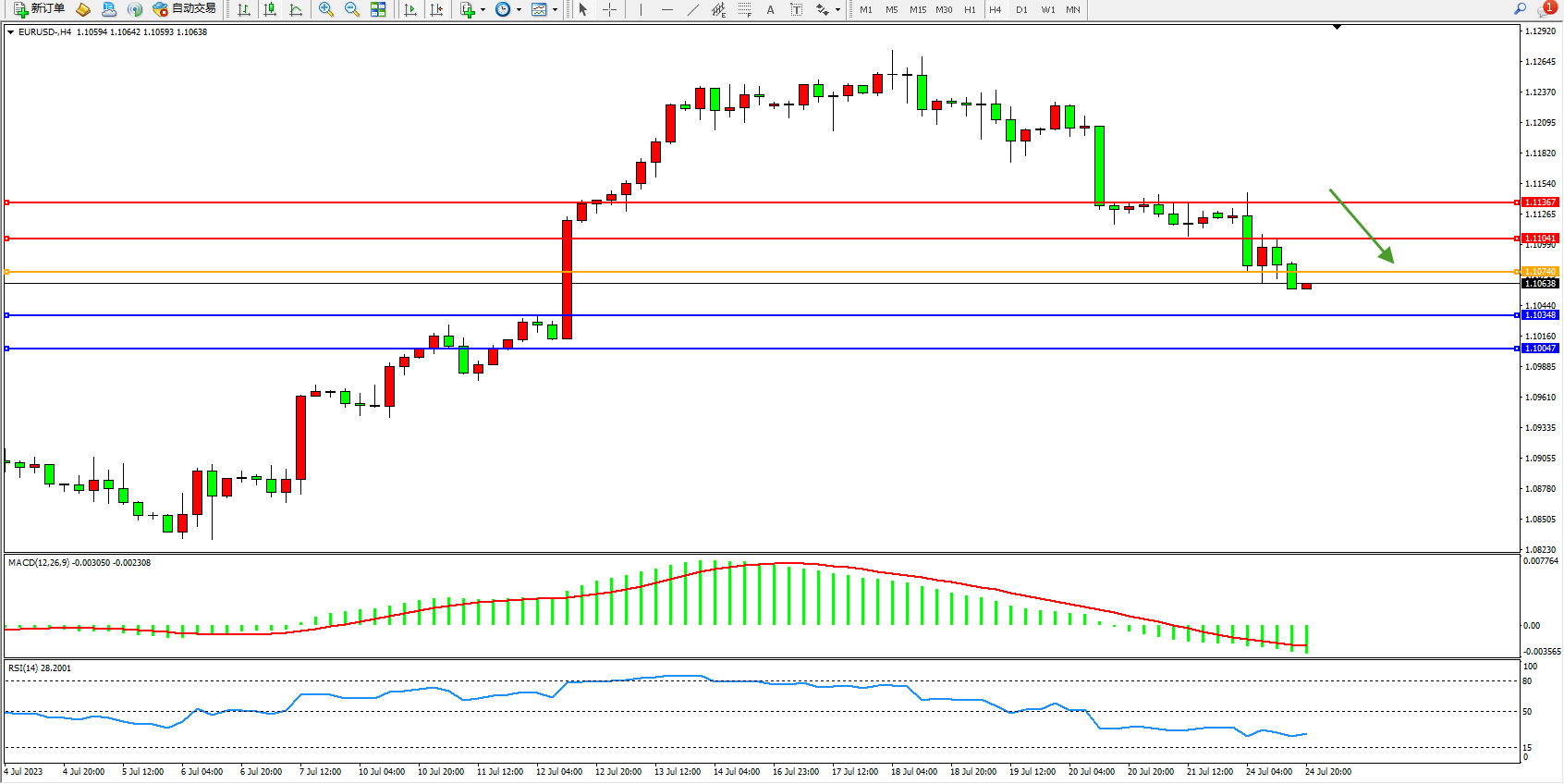 欧元美元EURUSD—4小时K线图显示: