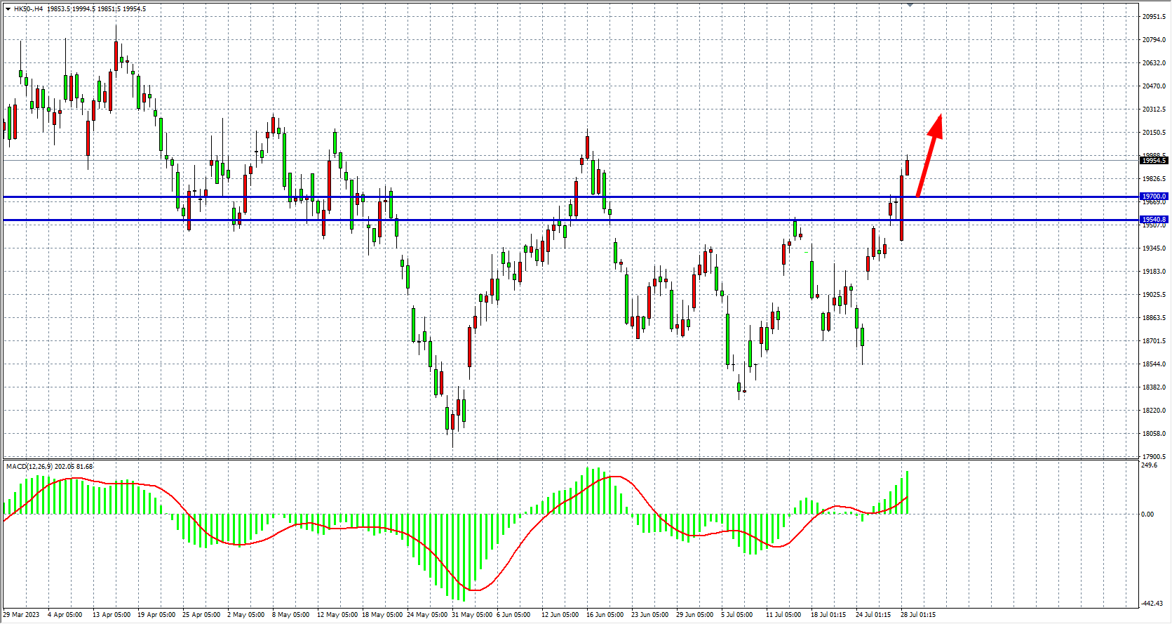 周五(7月28日)港股低开走高,三大指数维持强势上涨行情,恒指上涨1.41%,近期政策利好扎推袭来,本周三大指数皆走强,恒指涨超4%再度逼近二万点整数关。受传闻利好影响,大金融股拉升助力大市上行,美国经济超预期反弹令贵金属大幅承压,黄金股逆势走低。