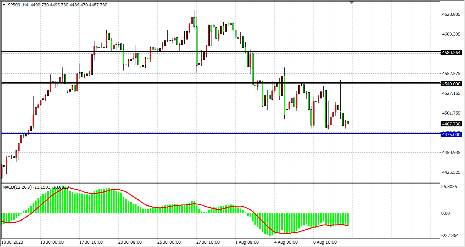 4小时图看,标普围绕4495附近继续震荡,MACD量能在零轴下缩量,行情走势仍较疲弱,支撑关注4475附近,阻力关注4540附近。