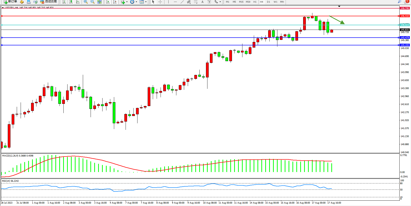 备选策略:146.023上方看涨,目标146.410 146.746