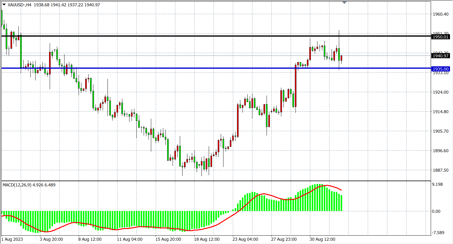 4小时图看,黄金涨至1950后受阻回落,在支撑1935再度止跌,行情进入震荡,支撑关注1935附近,阻力关注上1950-1960附近。