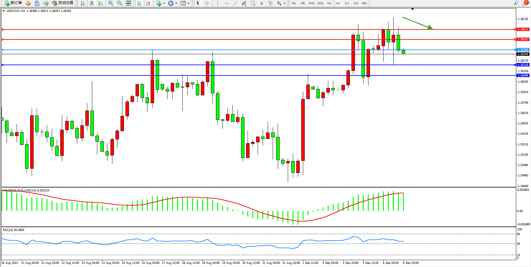 美元加元USDCAD——4小时K线图显示: