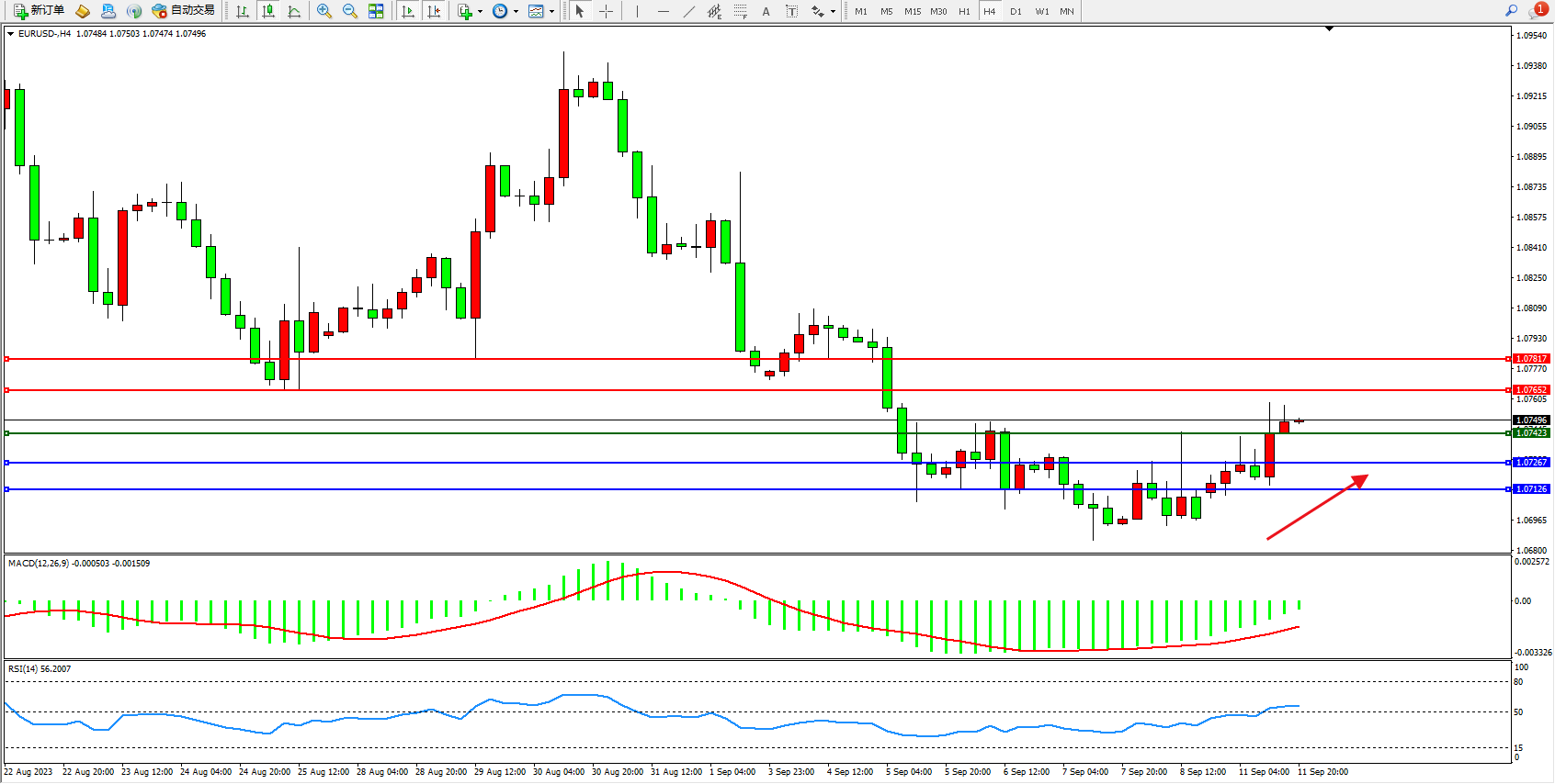 欧元兑美元维持1.07496附近震荡,欧洲央行是继续加息还是暂停创纪录的加息步伐,这是个难题。自2022年7月以来,欧洲央行已将利率从负值上调至3.75%。但倾向于欧洲央行暂停加息,预计加息的可能性约为40%。预期也一直在变化。