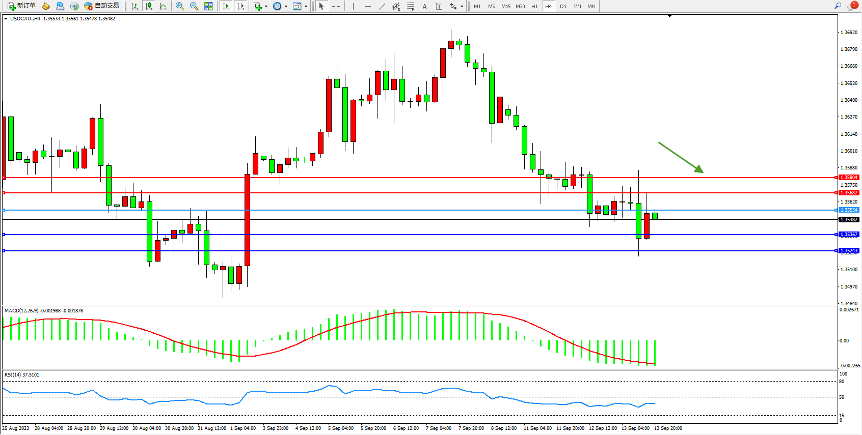 美元加元USDCAD——4小时K线图显示: