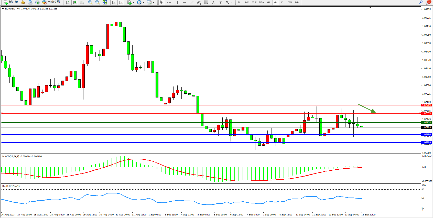 欧元美元EURUSD—4小时K线图显示: